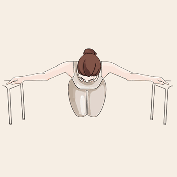 Passo 2: Dobre o tronco para a frente, estique totalmente os braços nos dois lados e coloque as palmas das mãos nas superfícies dos assentos. Certifique-se de que o tronco fica ligeiramente acima dos braços esticados.