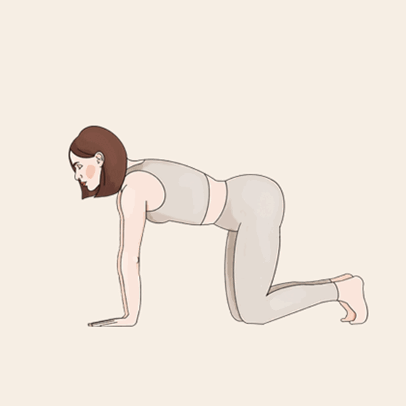 Passo 1: Coloque-se de gatas, com os braços e as ancas colocados verticalmente e as mãos a apontar para fora, num ângulo de 45 graus. Baixe a zona da virilha lentamente. À medida que a mobilidade das costas aumenta, pode esticar totalmente os braços e deslocar a cabeça para trás.