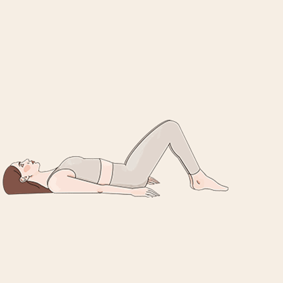 Passo 1: Deite-se de costas, pouse os pés no chão, com os joelhos fletidos, de modo que as ancas e a parte inferior das pernas formem um ângulo de 90 graus, e puxe o queixo o máximo possível em direção ao peito.