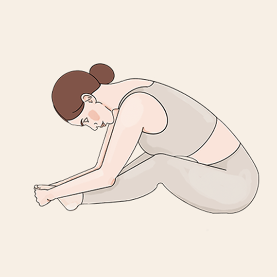 Passo 2: Agarre as biqueiras dos pés, leve o tronco para a frente e deixe pender a cabeça. Mantenha-se nesta posição de alongamento durante dois minutos e meio.